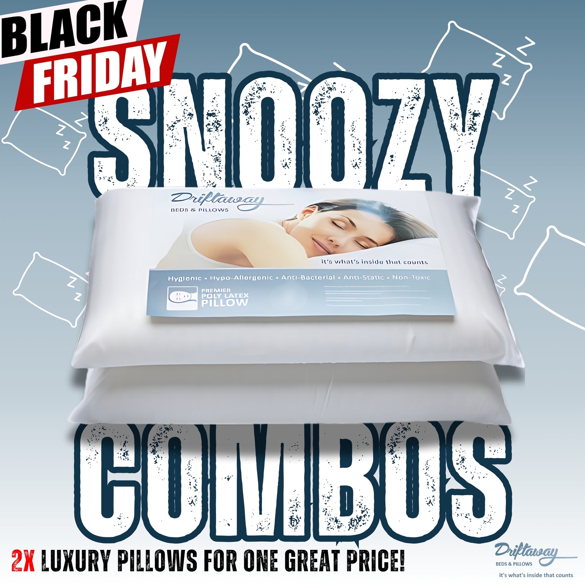 Upgrade your sleep setup this Black Friday with the Driftaway Snoozy Combo — two luxurious pillows for one unbeatable price. Designed to suit every sleeper’s preference, this combo lets you choose between: